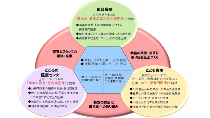 県立3病院が目指す病院像 県立3病院は、「質の高い医療の提供」と「より効率的な病院運営」の両立をめざして、平成21年4月1日から運営が「地方独立行政法人 静岡県立病院機構」に移行しました。 ※集学的治療:手術、化学療法、放射線治療を効果的に組み合わせた治療法 詳細につきましては以下の「静岡県立病院機構パンフレット」をご覧ください。 静岡県立病院機構パンフレット (PDF ファイル 7.41MB) 県立3病院の役割と特徴 静岡県立総合病院の役割と特徴 静岡県立こども病院の役割と特徴 静岡県立こころの医療センターの役割と特徴 お問い合わせ先 静岡県立病院機構 本部事務部 経営管理課 電話:054-200-1610 FAX:054-247-1021 住所:〒420-8527 静岡市葵区北安東4-27-1