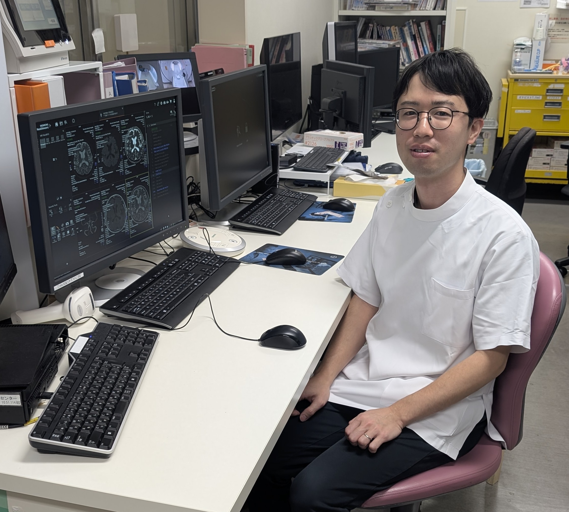 私は主にMRI業務を担当しています。院内には3Tが1台、1.5Tが3台の計4台のMRI装置があり、8時30分から17時15分まで、昼休憩を除き4台すべてがほぼフル稼働しています。