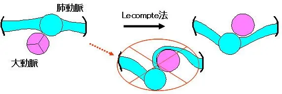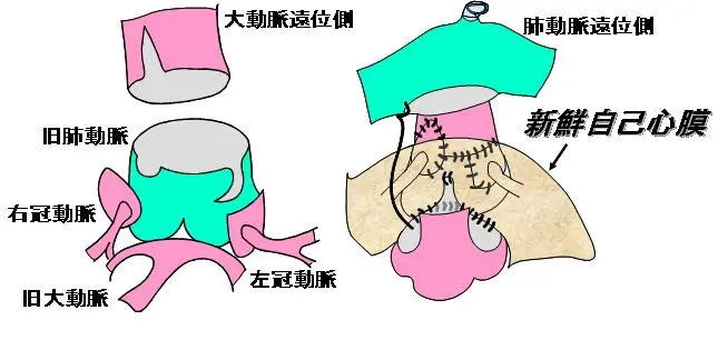 大動脈を切断し、冠動脈を大動脈の壁ごと採取し、旧肺動脈基部(新大動脈基部)に移植します。そこへ大動脈遠位側を吻合して新大動脈を再建します。大動脈と肺動脈の位置関係によっては、大動脈と肺動脈を前後に入れ替えて(Le Compte法)肺動脈のねじれを予防します。冠動脈採取部分は自己心膜で補填し、肺動脈遠位側を吻合して肺動脈を再建します。