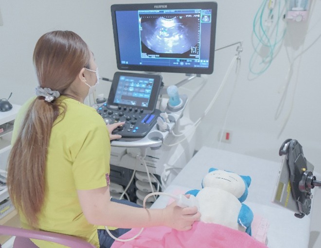当院では心臓超音波検査は循環器科医師または臨床検査技師が、腹部超音波検査は基本的に女性検査技師が対応していますが、小児外科の男性医師が行う場合もあります。