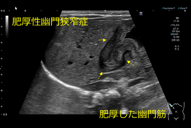 胃幽門部輪状筋の肥厚により幽門管が狭小化し、胃内容の通過障害をきたす状態のことです。