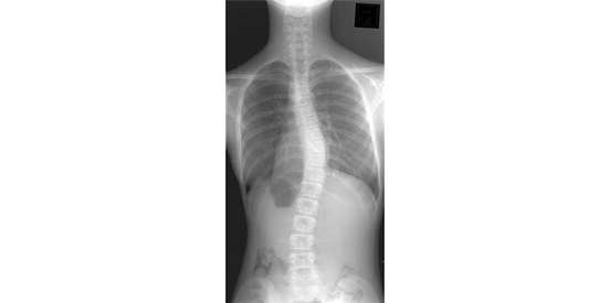 脳性麻痺、脊髄性筋萎縮症など麻痺性疾患に伴う側弯症。高度に進行すると胸郭変形による拘束性換気障害と椎体による気管への圧排による閉塞性換気障害をきたす。