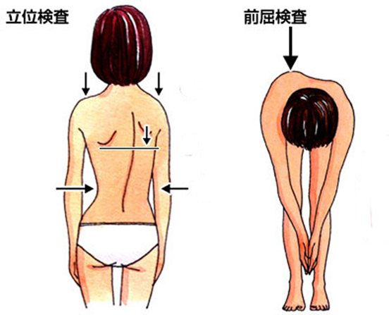 学校検診では、まず後ろ向きに気をつけの姿勢でまっすぐ立ってもらい、肩の高さ、肩甲骨(背中の出っ張りのある骨)、ウエストラインに左右差があるかどうか確認します(立位検査といいます)。その後、まっすぐ前かがみになってもらい、背中の高さが左右対称となっているか確認します(前屈検査といいます)。左右、非対称となっている場合には「側弯症の疑い」として、お医者さん(整形外科)への受診を指示されます。