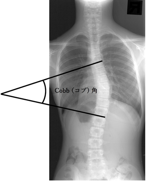 側弯症は、レントゲン検査によって診断され、背骨の弯曲の程度は図のように、「コブ角」という指標で表されます。「コブ角」とは、脊柱の上下で最も曲がりの強い椎体から直線を伸ばし、その 2本の直線の交差する角度のことを示します。