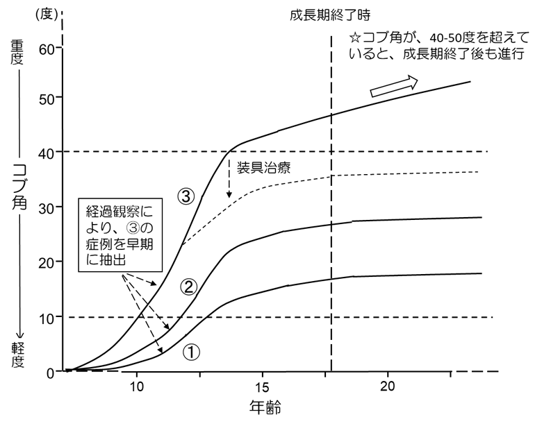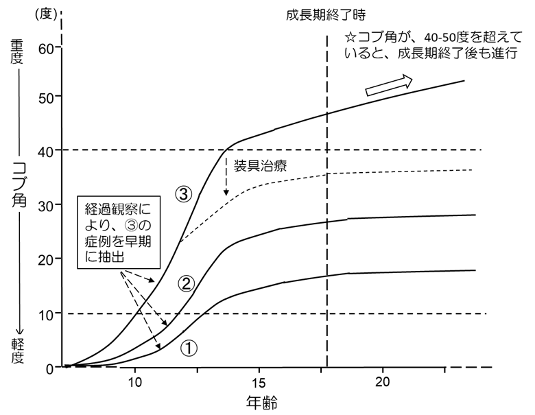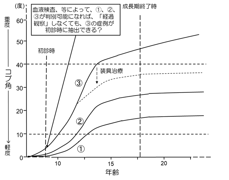 ③の方にとってみると「放置している」と感じられるお気持ちはよくわかります。今後、研究が進歩し、初回の診察時に「血液検査でこの値が上がっているから、あなたは③ですよ」なんて事が分かる時代が来れば、「経過観察」などせずに、診断時から装具治療を検討するといった時代が来るかもしれません 。しかし、そのような鑑別手法が確立していない現在においては、患者さんを「経過観察」し、この人は①だから大丈夫そうだな、とか、③なので装具が必要になるな、という事を判別していくしか方法がないのだと思います。
