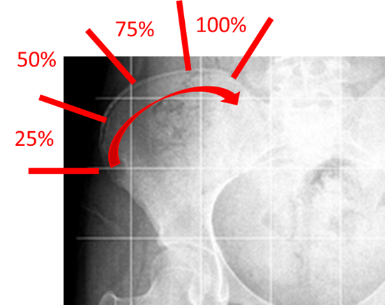 実際の診療現場では、コブ角だけでなく、骨盤の腸骨という部分の骨(お尻の部分)を見て、リッサーサインという指標を評価し、背骨の成長程度を把握しています。リッサーサインは、腸骨の上の外側から内側へ骨の成熟(骨化)が進んでいく過程をみたもので、グレート0(骨化がみられない)、グレード1(骨化が 25%)、グレード2(50%)、グレード3(75%)、グレード4(100%だが骨盤との融合なし)、グレード5(骨盤部の融合)の6つに分類されます。