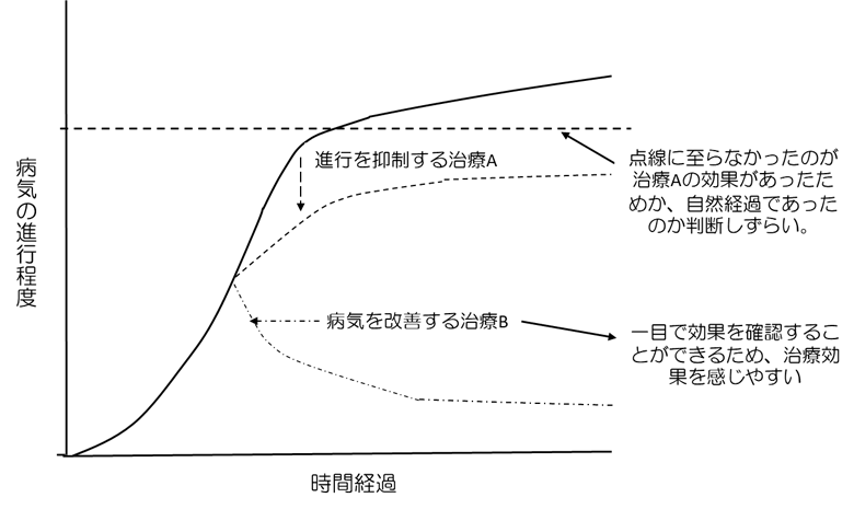 一方、Bさん個人をフォーカスすると「行わなくても問題ない」と結論付けられてしまいます。この場合、本当は治療効果がある治療を「効果がない」と結論付けられてしまう確率が上がってしまうわけです。すなわち、その治療が有効であるのか否かを判断する際には、個々の症例にフォーカスするのではなく、集団①と②のどちらが進行した患者さんの割合が少なかったか、という事実を比較する必要があるわけです。