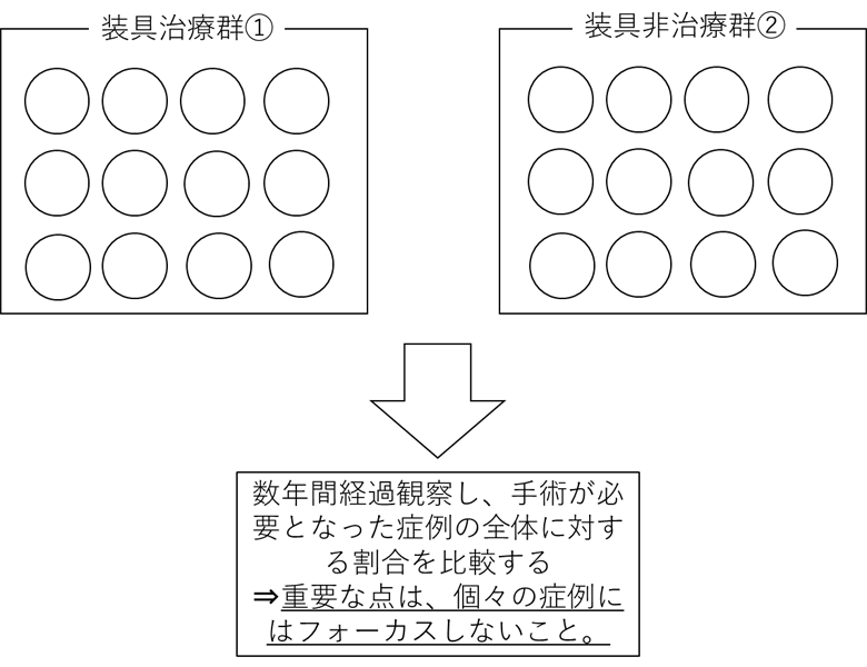 「装具が進行抑制に効果がある」と説明するためには、多くの患者さんを集めた後、「装具治療を行う患者さん集団①」と「装具治療を行わない患者さん集団②」に分け、ある一定期間観察した後、進行した患者さんの割合を比較する必要があります。