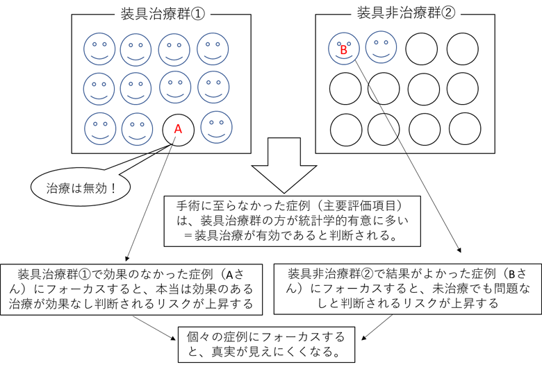 対象となる装具治療の効果があったとしても、個々の症例にフォーカスしてしまうと、誤った結論が導きだされてしまう可能性が高くなってしまいます。例えば、Aさんとすれば「治療効果はない」と考えるわけですから、Aさんをフォーカスしてしまうと、「実際には効果があるといわれる治療を効果がない」と結論づけてしまう確率が上昇します。