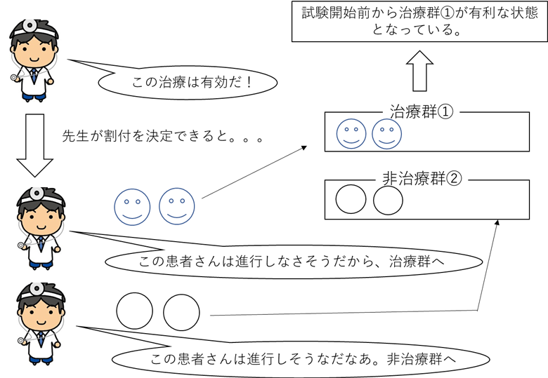 仮に、主治医の先生が患者さんを装具治療実施群①と行わない群②のどちらに入るか選べたとします。この場合、その先生が「装具治療は有効である」と考えていれば、進行がゆっくりそうだなと予測する方を装具治療群①に、装具治療を行わない集団②には進行が早そうだなと予測する患者さんを割り付けることが可能になってしまいます。