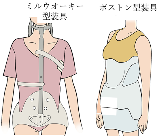 装具の歴史は古く、半世紀以上前にミルウオーキー型装具が開発されました。この装具は、体幹を腰周囲のガードルで固定し、そこから顎に向かって身体の前に1本、後ろに2本、金属棒を伸ばし、首の周りで固定される構造になっていました 。見た目の問題や装着のしづらさから、使用し続けてもらうことは難しいという問題がありました。