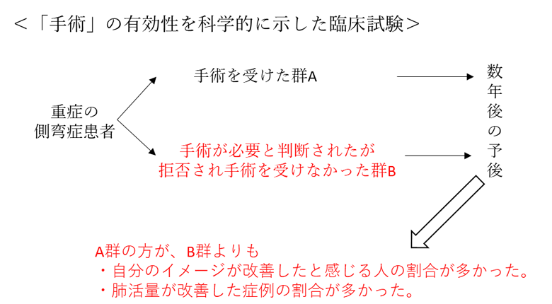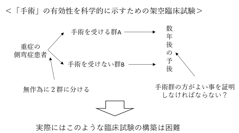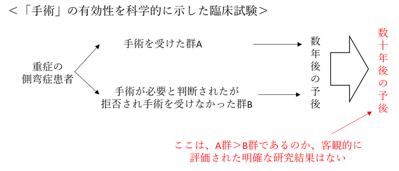 しかし実際、手術療法では装具治療や運動療法のように、「治療を受けた群」と「治療を受けなかった集団」を無作為化して割付し、比較した臨床研究はありません。それにもかかわらず、なぜ先生達は「手術療法」は効果が確立された治療であるというのでしょうか?