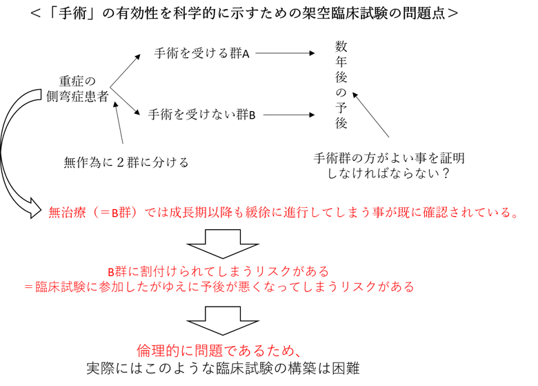 「手術療法」の臨床研究を行うにあたり、「治療を受けた群」と「治療を受けなかった群」に割り付け比較することのできない理由は、「手術療法」は最後の手段であり、その適応となるのは、既にコブ角が 40°を超えている進行された患者さんであるためです。