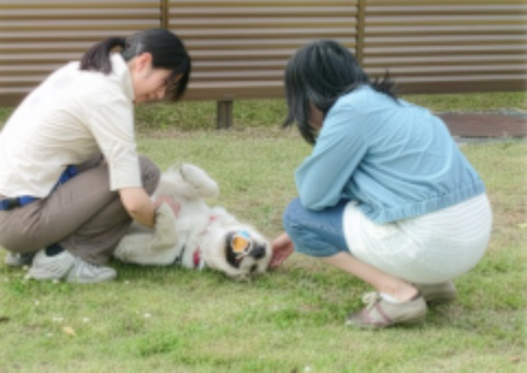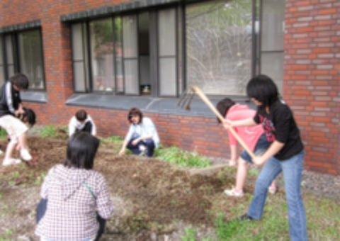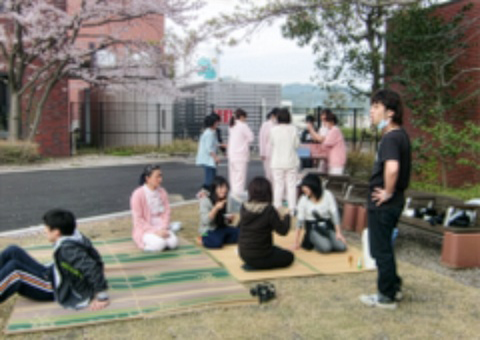 芝生一面の中庭では、散歩やバトミントンなどをしています。