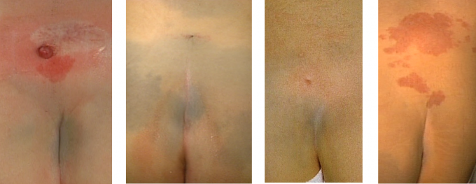 潜在性二分脊椎は、表面が皮膚で覆われているため発見が難しいですが、腰の部分に凹み、膨らみ、発毛、血管腫などの“告げ口徴候”を認めることがあります(写真)。