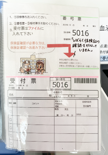 - 受付票には、身体計測・検体検査の有無、診察のコメントや診察室のあるエリアの案内など、その日のスケジュールが記載されています。