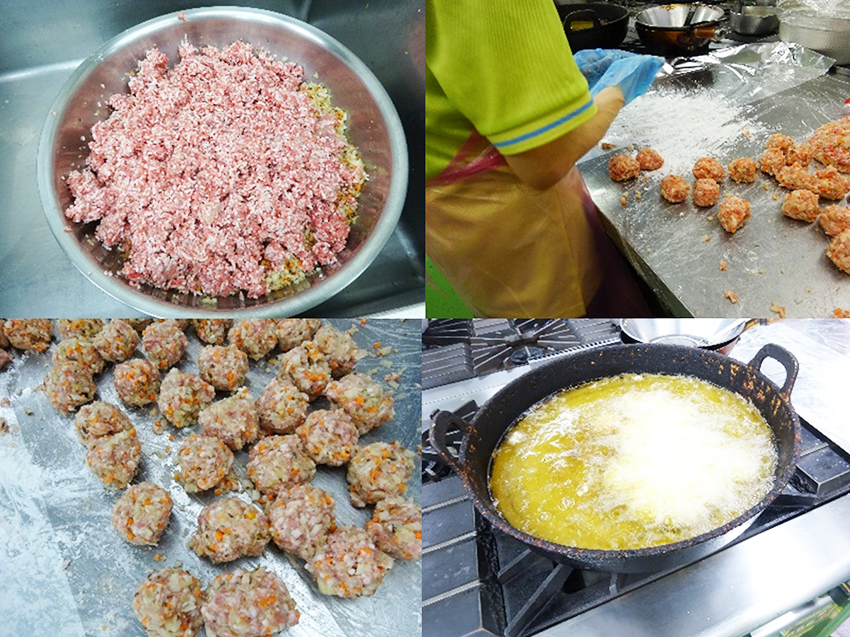 お肉と切った野菜をまるめて、油であげるよ。