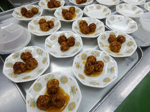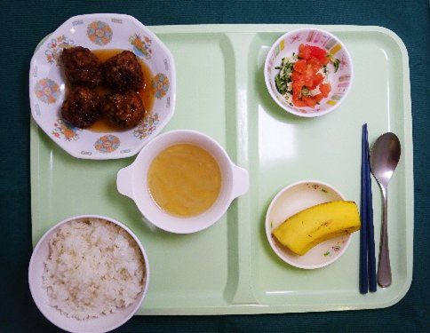 今日のメニューは、ごはん・甘辛にくだんご・バンバンジー・スープ・バナナだよ!