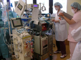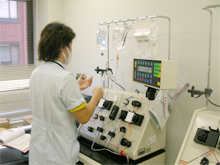 「血液浄化」とは、体内に貯った老廃物などを排泄あるいは、代謝する機能が働かなくなった場合に、専用の機械や道具を用い、体の中に貯った老廃物をきれいにする治療法です。具体的には,血液透析療法(HD)、持続的血液透析ろ過法(CHDF)、血しょう交換療法(PE)、血液吸着療法等を腎臓内科の医師と協力しながら準備、治療、点検を行っています。