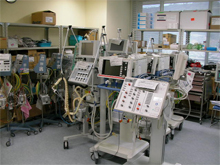 現在当院では15機種約70台の人工呼吸器、呼吸補助装置を保有しており、患児の大きさや状態に合わせて適切な呼吸器が選択使用できるよう、保守点検を実施しています。また、各病棟において定期的な回路交換業務を行っています。