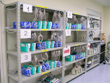 「医療機器の保守点検業務」は、院内における医療機器の保守・点検・修理を行っています。年間約600件の保守・点検と年間約350件の修理を行っています。また平成19年度6月より、外科病棟移転に伴い、医療機器の定期点検と汎用機器の集中管理により、機器の安全性の向上と効率的な運用を提供するために、ME機器中央管理室が設置されました。
