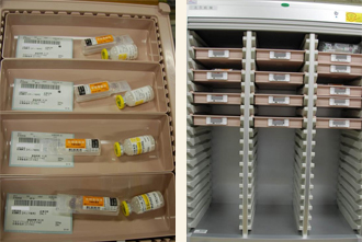 入院中の患者さんに使う注射薬は注射処方せんに基づいて、投与量、投与速度、投与ルート、配合変化、相互作用をチェックし、個人ごとに取り揃え各病棟へ払い出します。