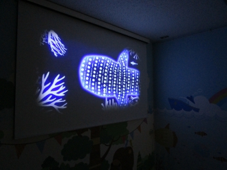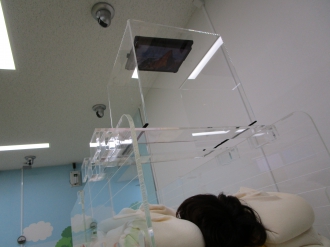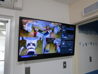 お子様のがんばりを付き添いの方も見られるように、待合に大型モニタを設置