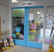 ガラスの周りの色の青色が北5病棟の目印。ガラスに貼ってある絵は季節ごとに変わっていきます。