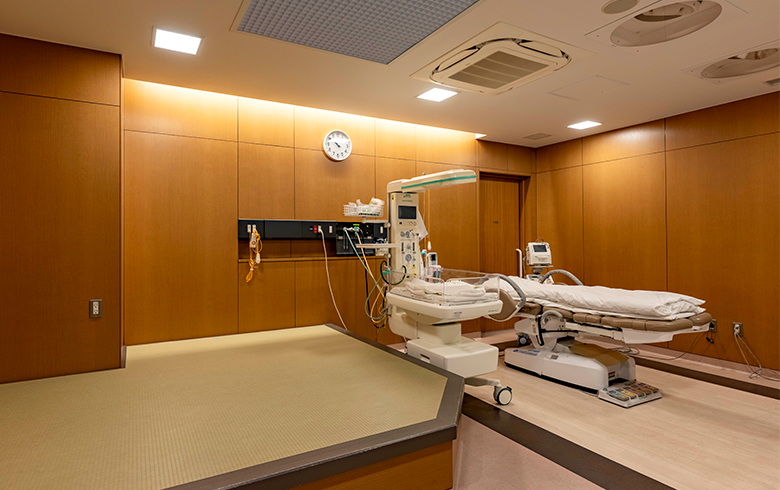 分娩時以外、医療機器は収納されているので、自宅の寝室のような家庭的な雰囲気のなかで過ごすことができます。また、お産の進行によって分娩室に移動する必要もないので、精神的にも肉体的にも負担が軽くなります。和室スペースもあり、よりくつろげる空間になっています。
